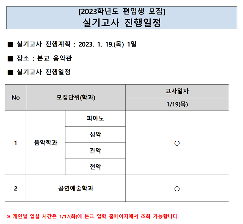 2023학년도 편입모집 예술학부 실기 일정 확정 안내
