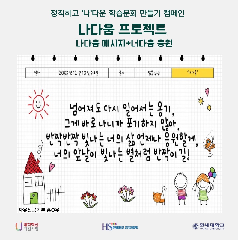 한세대학교 미래창의교육원 교양교육센터는 학습자의 소양을 강화하는 교양교육 강화를 위해 정직한 학습과 따뜻한 응원으로 당당한 ‘나’다운 학습문화 만들기 캠페인을 전개하여 참여자들은 나다움 학습 다짐과 나다움 캠페인을 응원하는 나다움 메시지를 담은 카드뉴스를 제작하여 자신의 SNS에서 표현하는 방식으로 진행되었다.