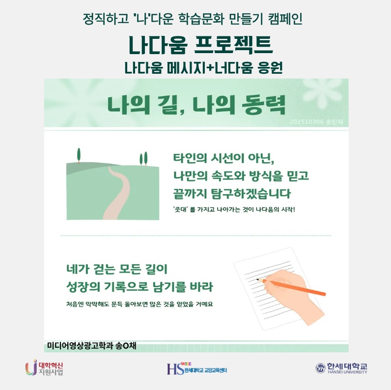교양교육센터는 ‘나다움 프로젝트’가 확산할 수 있도록 2025 나다움 프로젝트에 선정된 ‘나다움 메시지’를 인쇄물로 제작되어 학교 계단에 부착하여 많은 학생이 나다움 프로젝트에 참여할 수 있도록 홍보할 예정이다.
